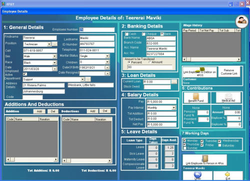 A complete Payroll system that can run independentlyOr -Can be used with 4POS or 4CLOCK!The 4PAY system has been designed with simplicity in mind and allows you to :Create all your employees with their static info; Name, address, telephone number, ID, passport details, leave allowed, leave taken (A proper leave register!), Loan register detailing loans taken, monies deducted & balance due!Payroll Additions w.r.t. bonusses, allowances eg, car, equipment & clothing can be entered & specified as taxable or not.Similarly, payroll deductions can be dealt with!Also, if you are using 4POS as your POS system, you can link these employee purchases to deduct stock purchased during the month or week.4PAY interfaces with our own 4CLOCK - a time-recording system that will track (With fingerprint / Biometric reader or Swipe card or simple codes) all staff logging in & out. On log-out the 4CLOCK can be configured to prompt for reasons logging out eg. Smoke break, Lunch, delivery etc.4PAY will deduct all required details when configured, Eg. Tax, UIF, Medical Aid etc by amount or percentage of gross salary.HR Functions :Makes notes of all incidents eg. Warning, disciplinary hearings etc.Print Employment contracts, Final settlements & Leave Forms.Reports available :Wage slips with coinage analysisCoinage reports to make your cash collection easier.Banking report to see which staff is being paid with bank transfers!Additions report by department.Deductions report by department.Medical aid etc contributions reports. (Both employees & employer)Automatic tax tables imported yearly. Currently only South African Tables available - others to follow soon!)