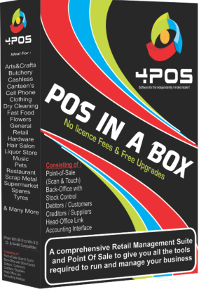 Welcome to the 4POS Application Suite of ProgramsThe 4POS Suite has been in development since 2002 in conjunction with our 18,000+ customers & personnel with a combined experience of more than 100 years in the POS & Retail marketplace.We Specialize in POS & ensuring our customers take control of their businesses again! Whether you are a small business or a multi-branch company - our Suite of programs is for you!Our software is distributed by a multitude of professionals from Afghanistan to Australia & everyone in between.Be assured that we will protect your investment with NO Licence fees & free Upgrades!We are the market leaders & intend to stay in front!The suite consists of :4POSA POS system with Stock Control, Debtors, Creditors & POS (Touchscreen & Scanning).4AIRAllows you to sell Airtime from your 4POS System & earn new customers &some extra profit!4LODGEA reservation system to manage your Lodge, Bed & Breakfast or Hotel.4CLOCKA clock-in system to control the time & attendance of your staff.4PAYA wages & payroll system to calculate your staff wages & salaries & ALL deductions - statutory (By law) or otherwise. It even has a leave register to help with all those days taken off.4MEATA Meat block-test program to ensure your maximizing your profits in the cutting of meat carcasses.4VEGA Fruit & Veg production system to control the profitability & stock of every purchase from the market.4JOBSA Job-card system to control all your repairs & tasks that you & your company does. Full serial tracking per Job.4CRMA customer relationship management system to allow your sales personnel to call every potential customer when agreed to & also to keep track of the potential value of your sales & also how successfull their closing skills are!4TFMA comprehensive accounting system consisting of Cashbook & General Ledger.Multiple bank accounts, import of bank statements, Bank reconciliations. A GLsystem with 13 months per year allocations (Allows you to trade in the new financial year but still post in the old…, Financial statements, Trial Balance, Create your own Financial statements & many more features.